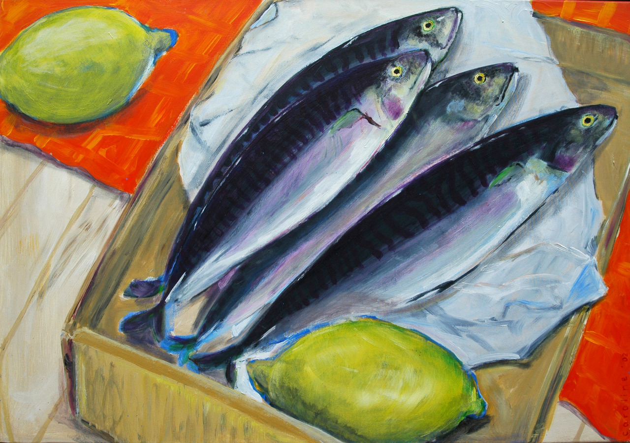 Ik ben dol op spartelende visjes. Deze makreeltjes hebben zoveel mooie kleuren in hun vel; paars, zilver, blauw, groen. Wat een uitdaging!