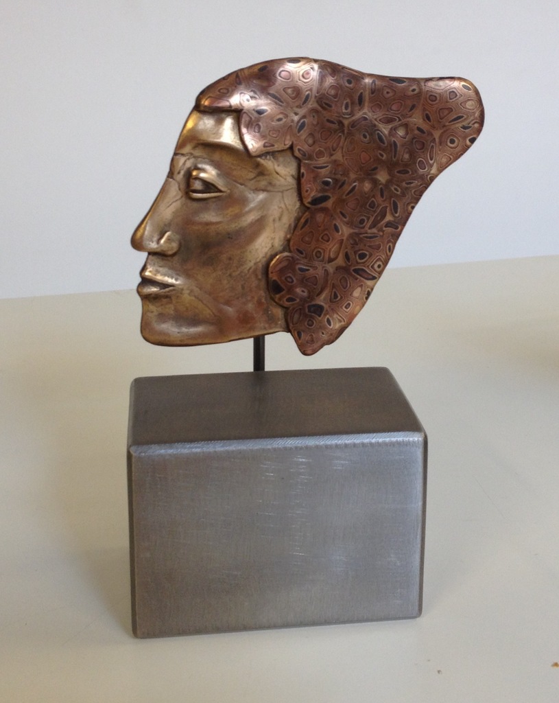 Brons met micro mosaic van brons, koper en staal. Blokvoet van gelast RVS (niet afgebeeld). Afmetingen zonder voet.