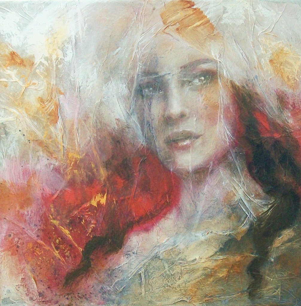 Abstract Rood Acryl Mysterieus Vrouw Portret Mixed Media Gemengde Techniek Gezicht Canvas Vierkant Doek Abstraherend Red Acrylic Female Face Warm Textuur Verf Streep Vlek Triptych