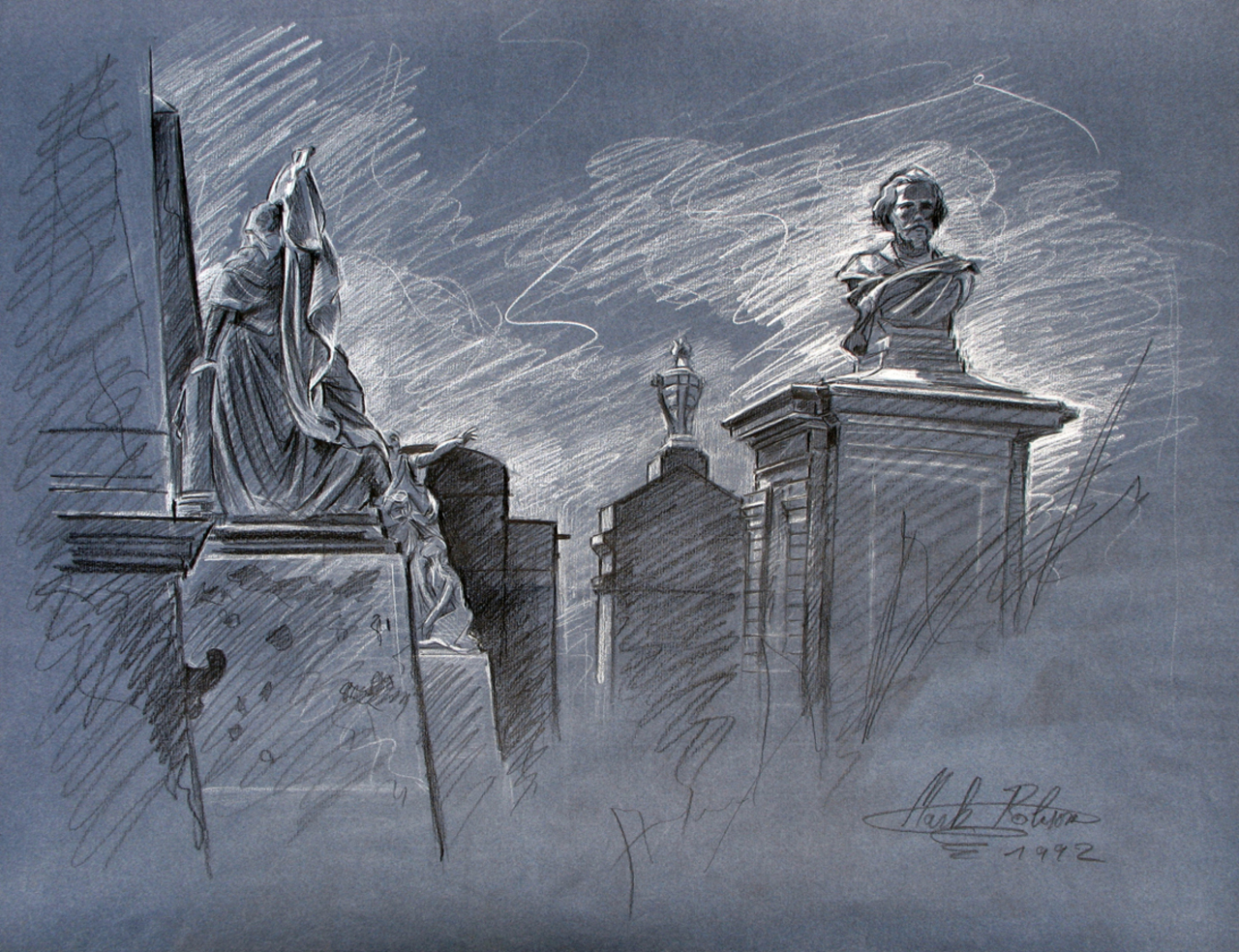 Studie gemaakt op de begraafplaats Schoonselhof te Hoboken bij Antwerpen. Dit deel van de ruime begraafplaats noemt men het Monumentenpark. Pastelpotlood.