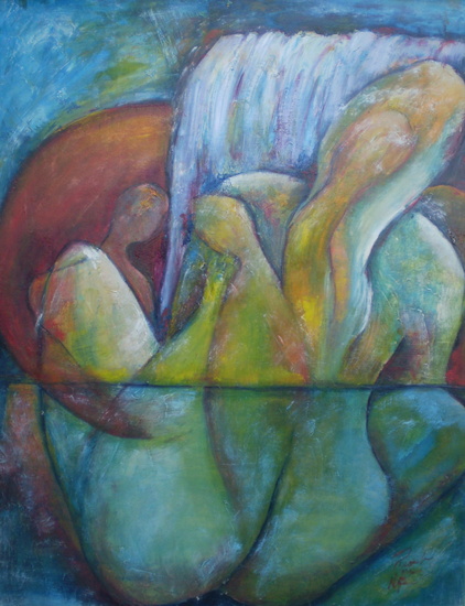 Zittende naakte vrouwenfiguur gezien op de rug. De vrouw zit in water en er zijn een wat surrealistische waterval en figuren in de achtergrond.