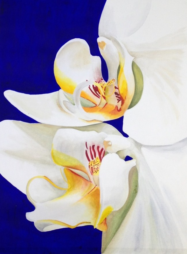 Schildering van twee orchidee harten. Eitte orchideeën op een blauwe achtergrond.