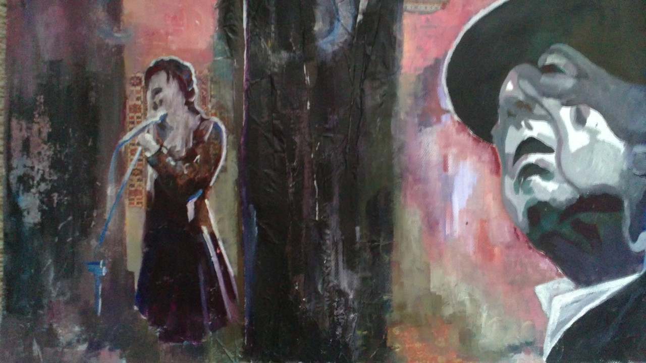 Leonard Cohen, geschilderd naar een foto genomen vanaf de TV