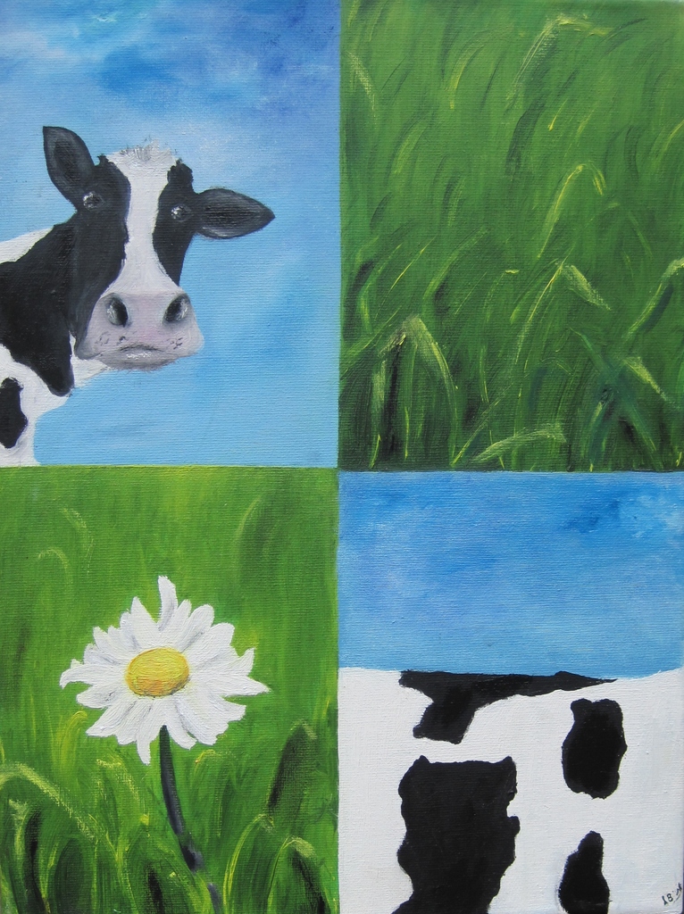 Olieverfschilderij verdeeld in 4 vakken; 2 delen met koe en 2 delen met gras