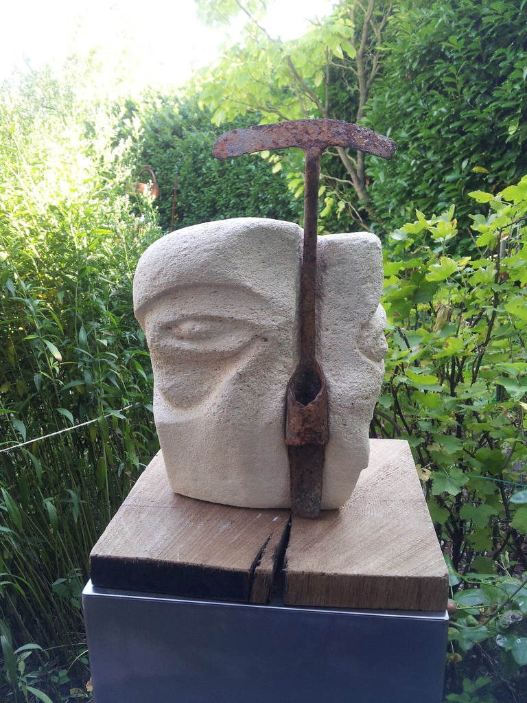 Uit zandsteen gehouwen gezicht, met als detail onze oude schoffel.