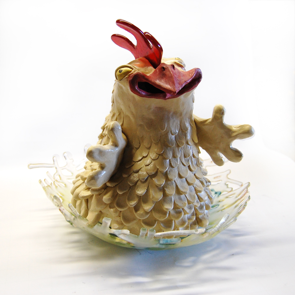deze blije kip is gemaakt van geglazuurd keramiek, heeft een lelletje van gefused glas, en hij zit in glazen nest