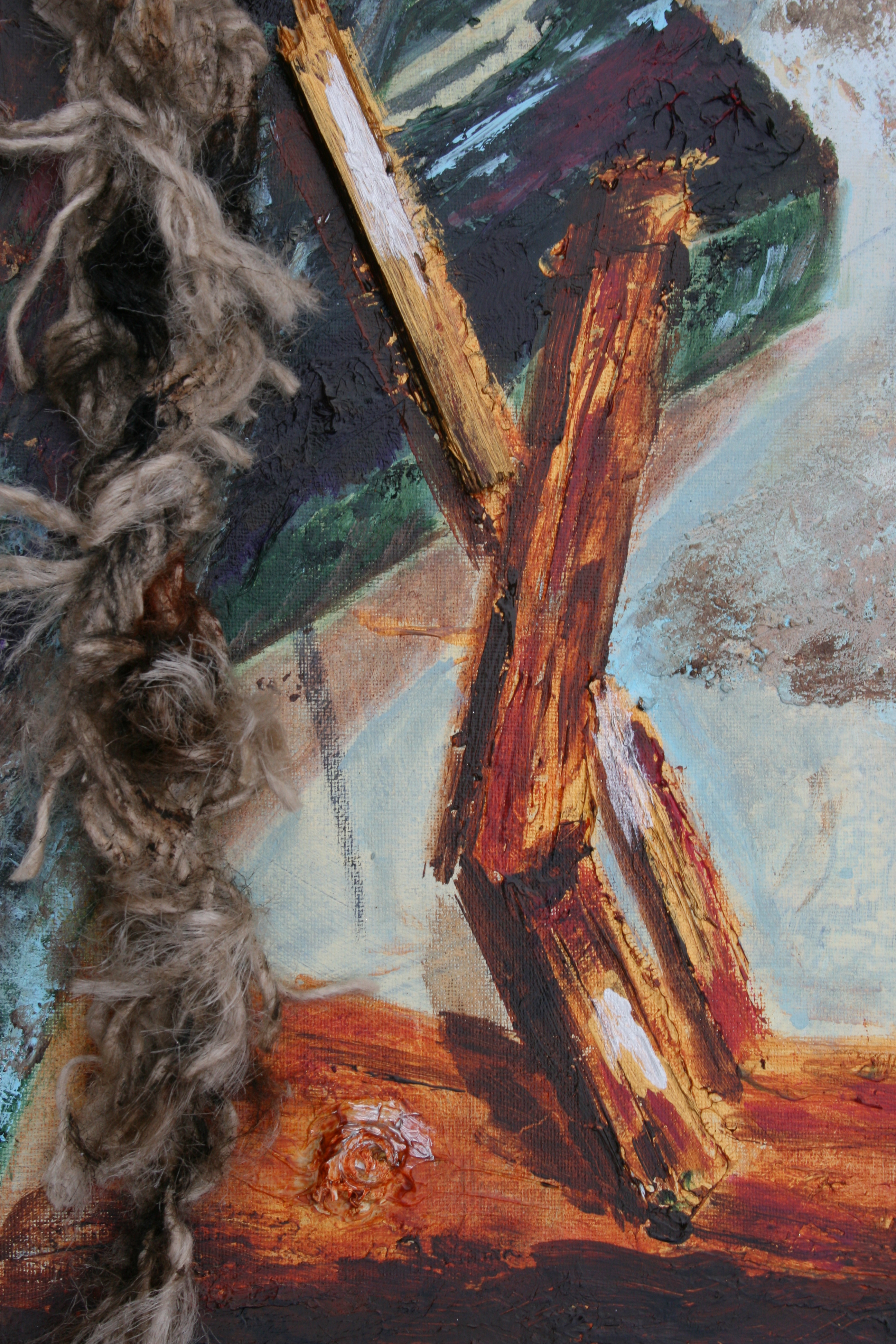 Gemengde techniek, waaronder hout, touw, papier met acrylverf