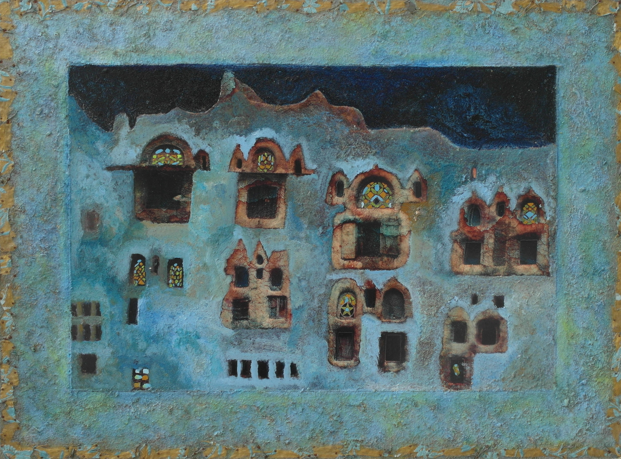Ik ben een materialen mens, en maak samenvoegingen van verschillende materialen; foto’s, stoffen en borduursels, soms ook gecombineerd met hout, lood en steen, op wisselende formaten