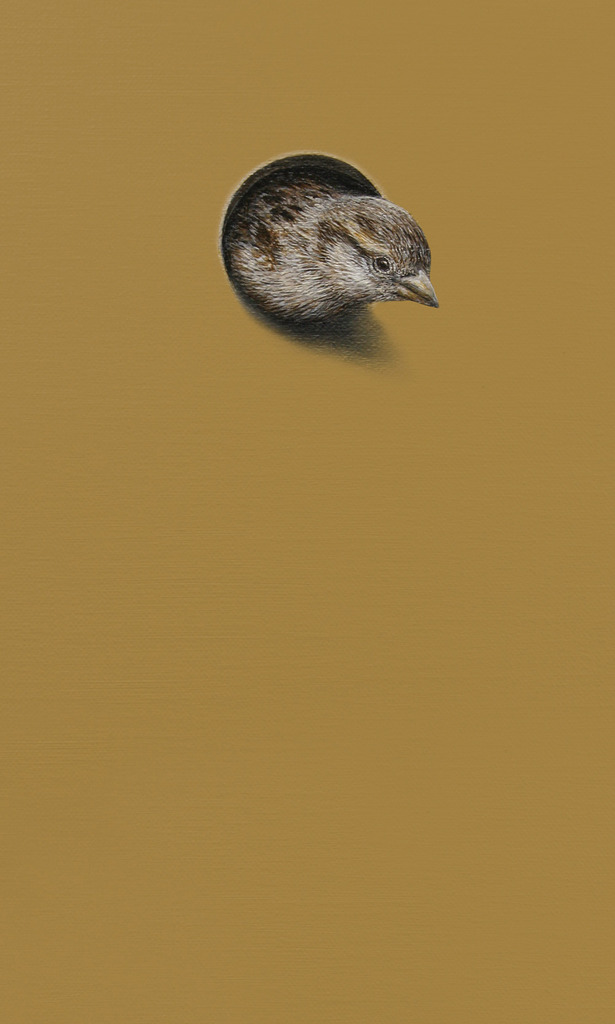 Huismus (Passer domesticus). Dit doekje maakt onderdeel uit van de geschilderde installatie 'Multicultural'. Meer informatie over het project kun lezen op de informatiepagina.