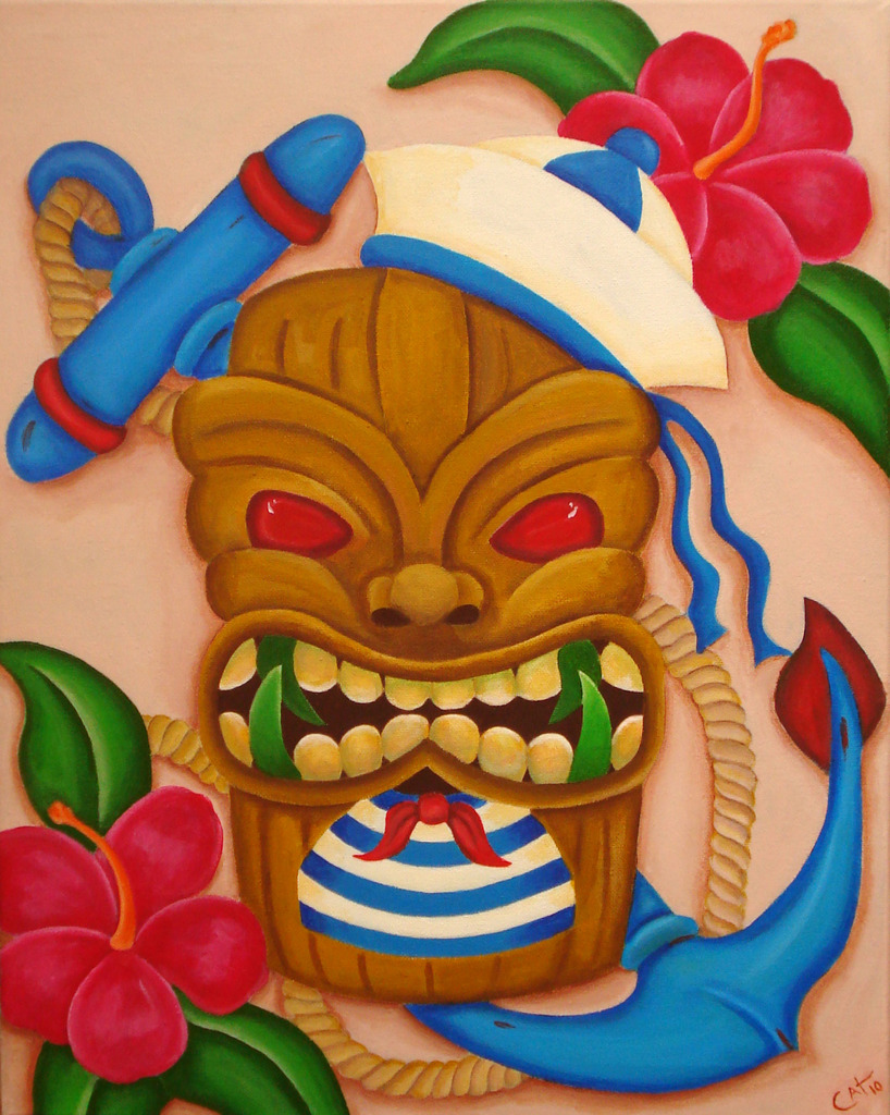 Blauw Acryl Groen Bruin Doek Tropisch Sureeel Roze Anker Oldschool Magenta Sailor Hibiscus Hawai Tiki Zeeman Tikibeeld