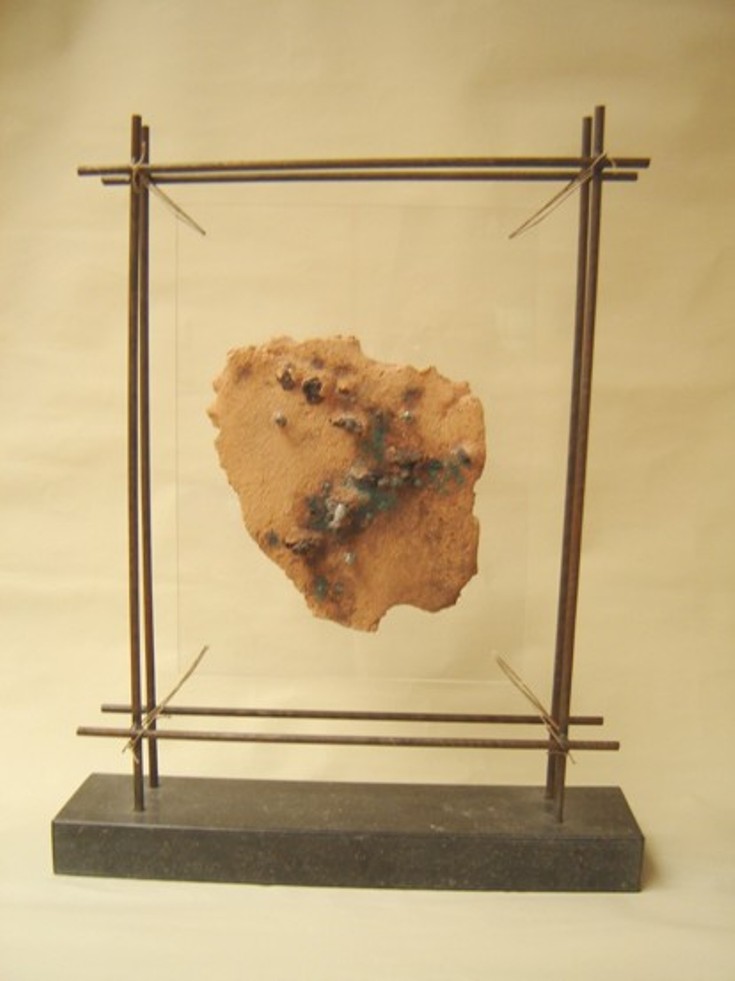 Van stof en as zijn we tot stof en as keren we weer. keramiek gemonteerd op plexi geassembleerd met ijzeren frame op blauwsteen voet.