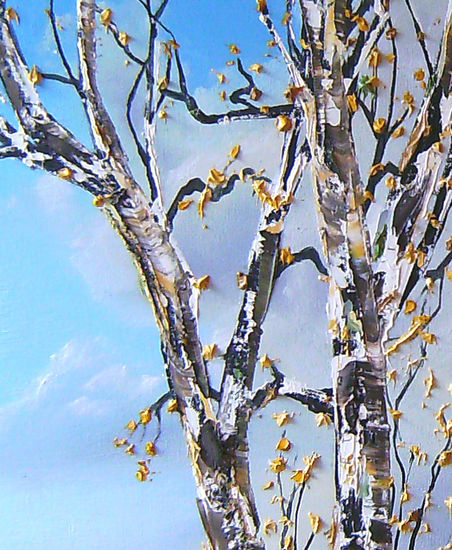 detail van 'De Berken' Hier ziet u hoe dik de blaadjes en de schors op het doek zitten.