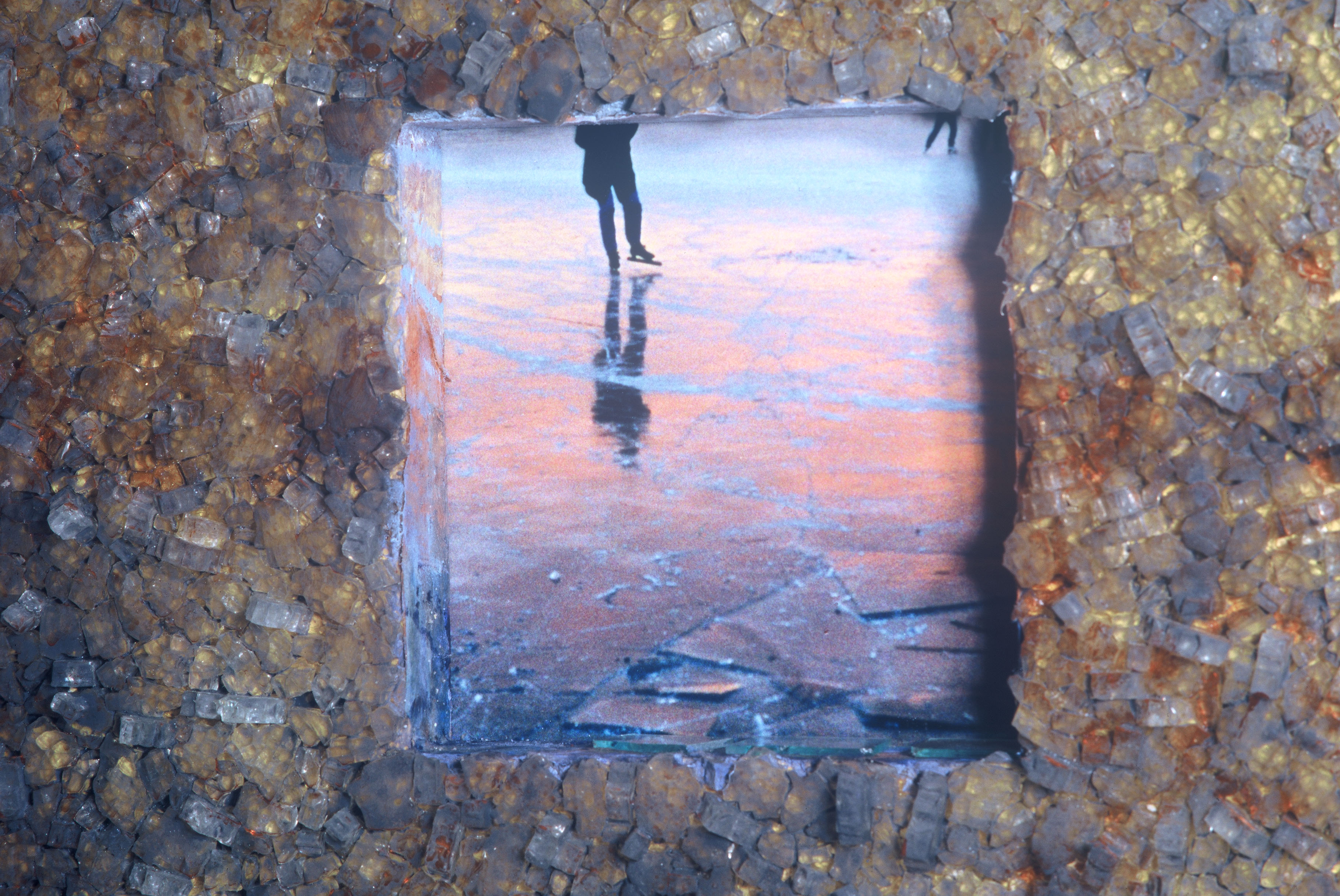 Fotografie van schaatser met wak, in verdiept houten blok. Blok beplakt met scherven glas en doorgeschilderde omgeving. Loden rand