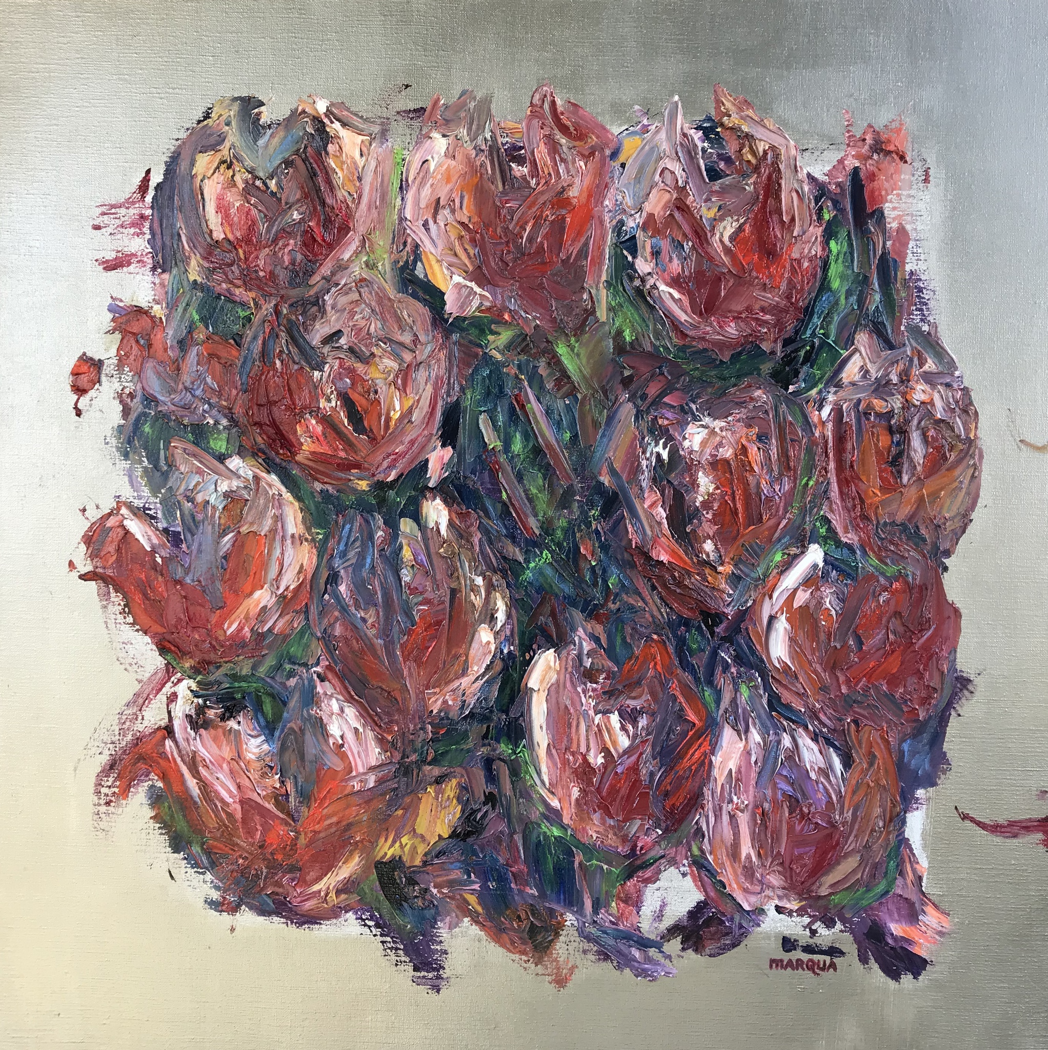 Abstracte bloemachtigen in paarstinten met zilver venster. Acryl- en olieverf en kaoline op linnen doek 90x90 cm.