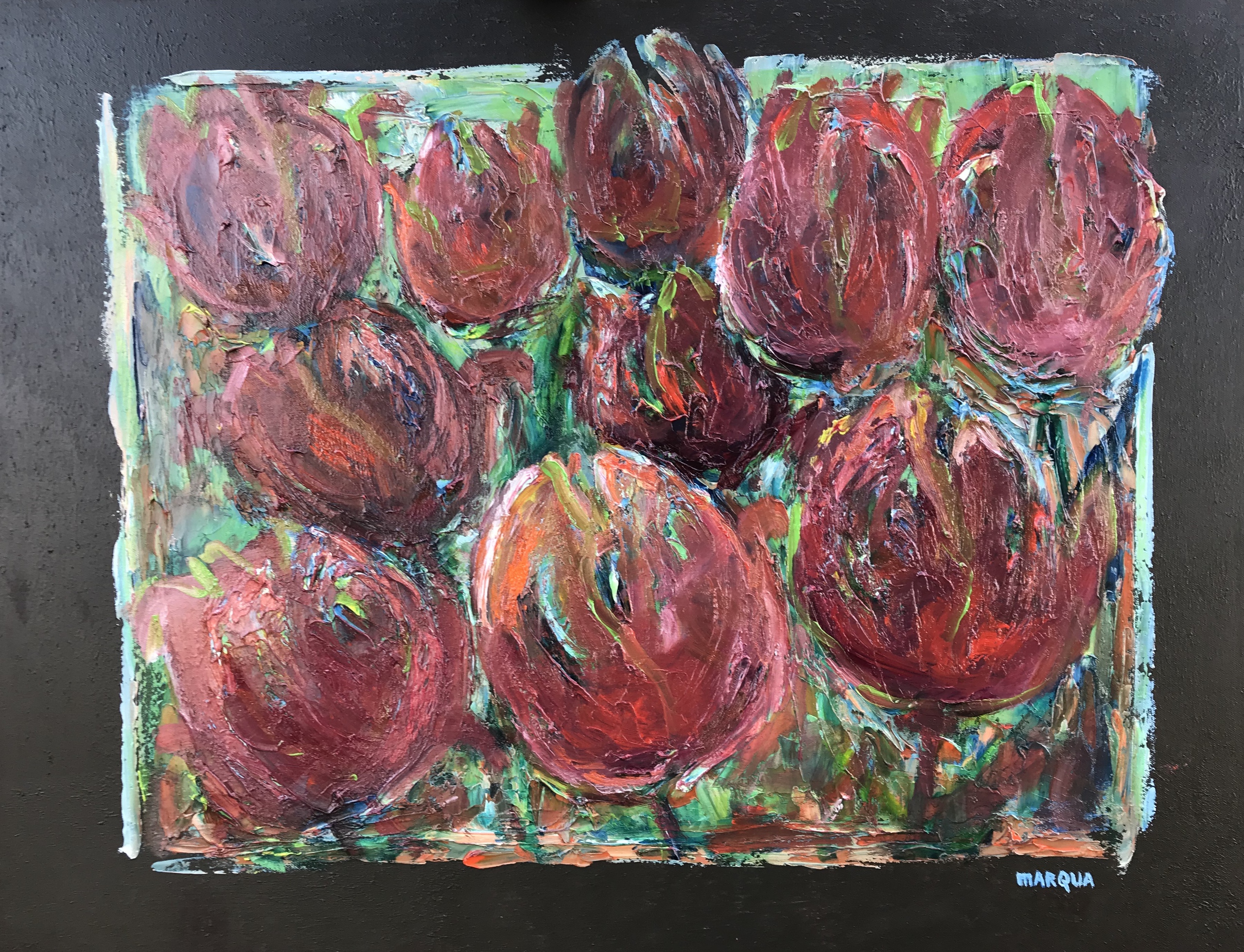 Tulpachtigen fantasie in acryl- en olieverf en kaoline op doek 70x90x4 cm. Kleurrijk op umber venster.