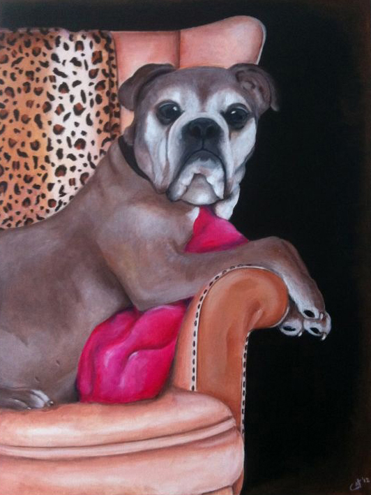Acryl Portret Bruin Stoel Dier Doek Hond Huisdier Dierenportret Max Boxer Huisdierportret