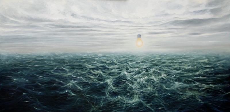 Zeegezicht Surreeel Olieverf Zee Golven Wolkenlucht Gloeilamp Schilderij