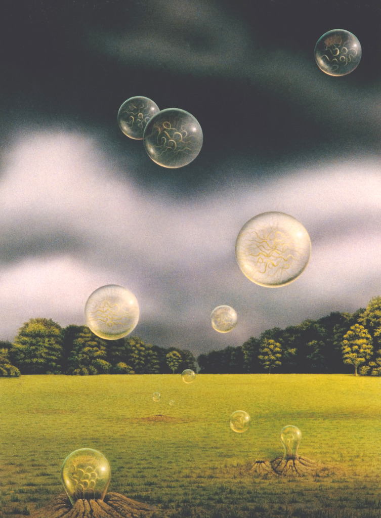 Landschap met bellen met zaden erin die opstijgen om zich te verspreiden en weer uit te lopen als nieuwe plant (fantasie) Dit eerdere werk was een inspiratiebron om later " UIT HET STOF ZIJT GIJ GEBOREN EN TOT STOF ZULT GIJ WEDERKEREN" te maken met hetzelfde idee erachter.