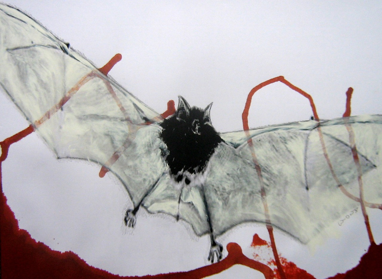 Vleermuis is een teken van wedergeboorte van een gedeelte van jezelf, of van de dood van oude patronen. Als je je verzet tegen je toekomst, kan het gaan om een lange, uitgesponnen, pijnlijke dood. Het universum vraagt altijd van je dat je groeit en je toekomstige zelf wordt. Tekening inkt en olieverf