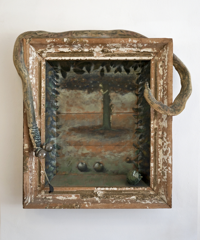 Het is vooral associatie.Je hebt aantal voorwerpen die je helpen je fantasie in beweging te zetten. De 3-d appel is een persoonlijk aspect, verwijzend naar Kees Franse om zo hem te gedenken en zijn beelden van enorme appels die ergens op Schiphol staan en in Rotterdam aan een singel.