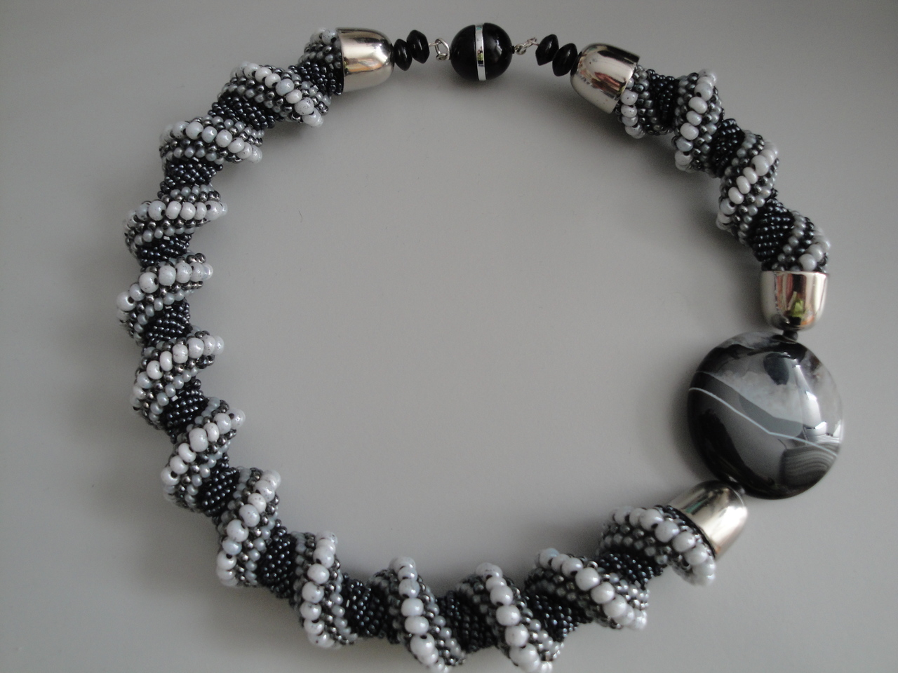 asymetrisch halssieraad van glaskraaltjes in anthraciet en verschillende tinten grijs, in spiraalvorm geregen, voorzien van een grote platte halfedelsteen (doorsnede 4 cm). sluiting met een zwart magneetslot; lengte ongeveer 46 cm (verkocht)