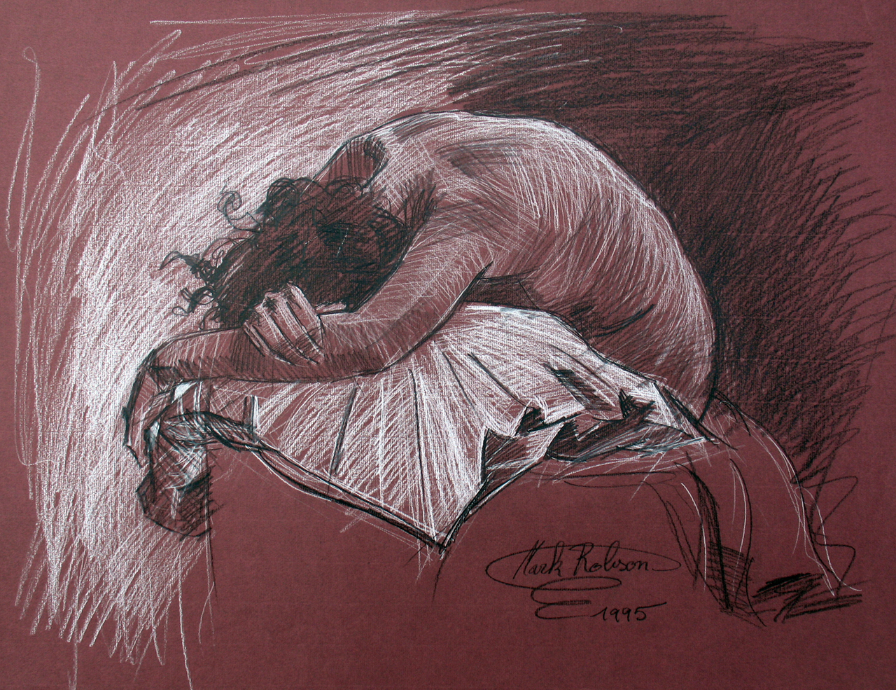 Naaktmodel steunend op een kussen. Het geheel heeft mee door de belichting een beetje een dramatische uitstraling. Pastelpotlood op bordeaux-kleurige ondergrond.
