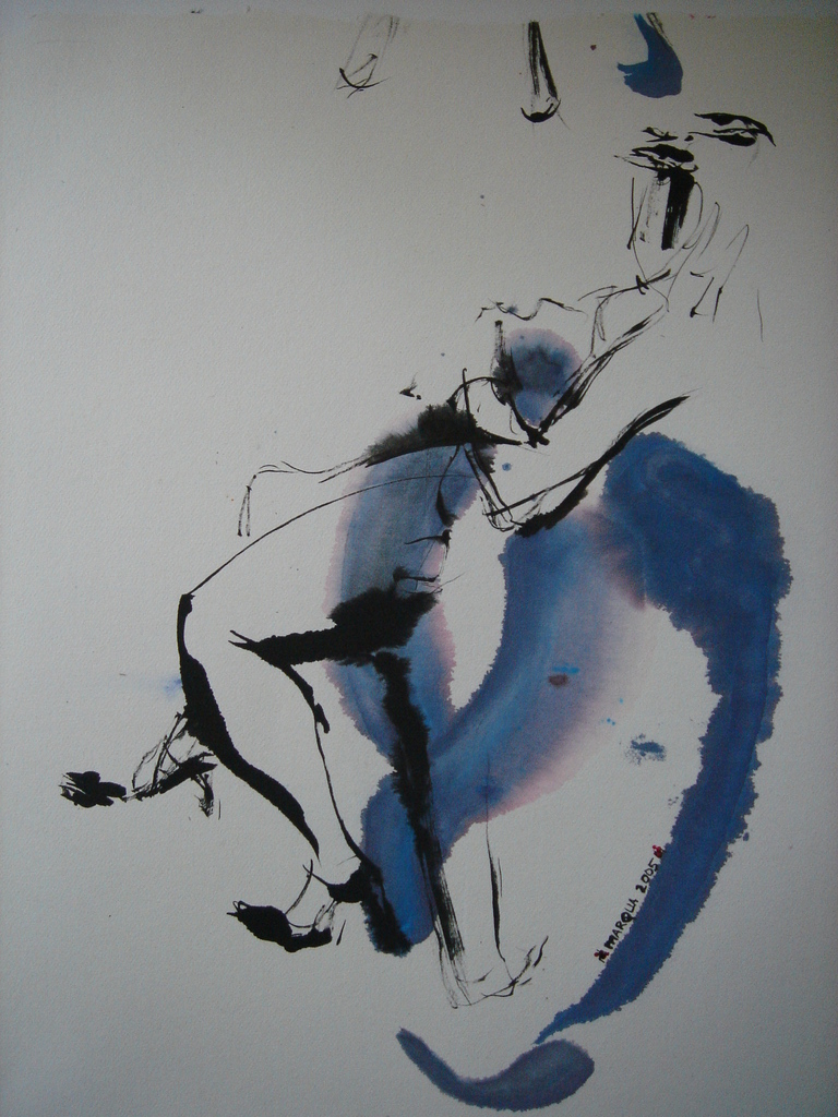 SUMI-E: Oosterse techniek, in inkt en aquarelverf op rijstpapier en daarna verwerkt op aquarelpapier 50x70 cm. Vrouw op stoel in blauw.