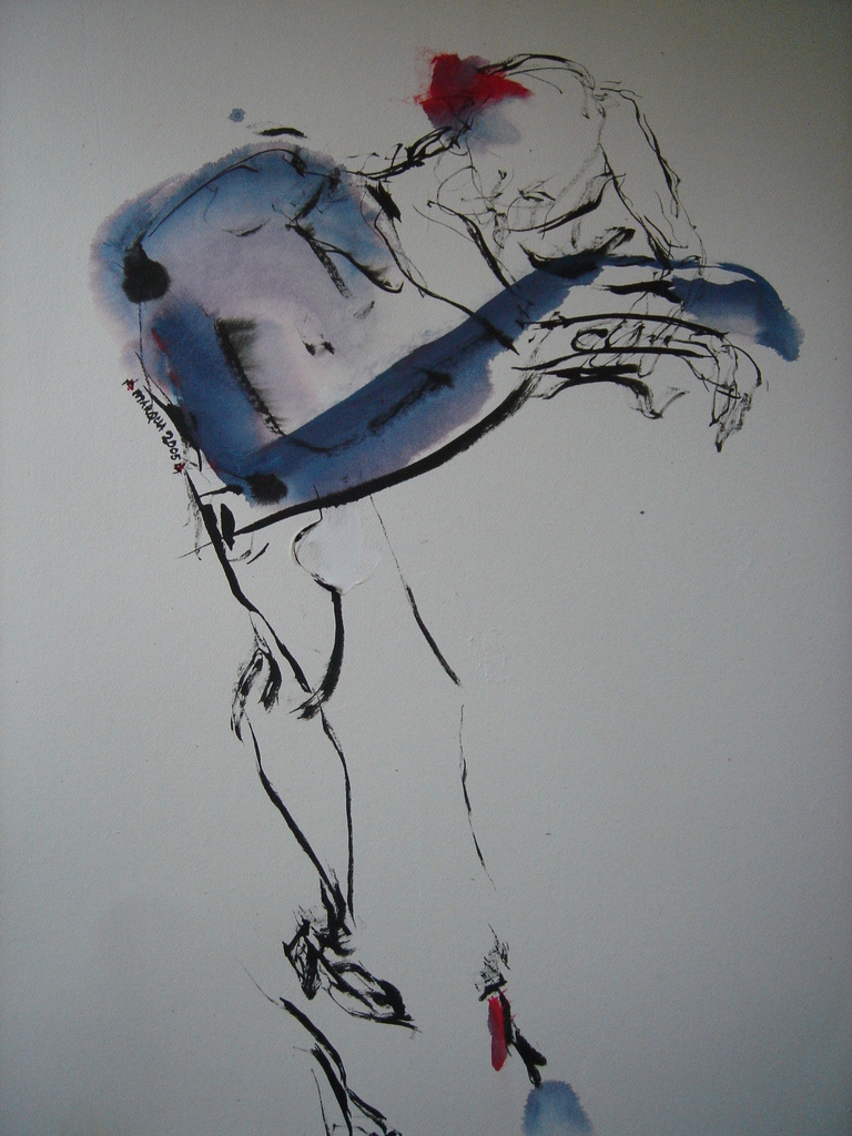 SUMI-E: Oosterse techniek, in inkt en aquarelverf op rijstpapier en daarna verwerkt op aquarelpapier 50x70 cm .Dansende vrouw in blauw.