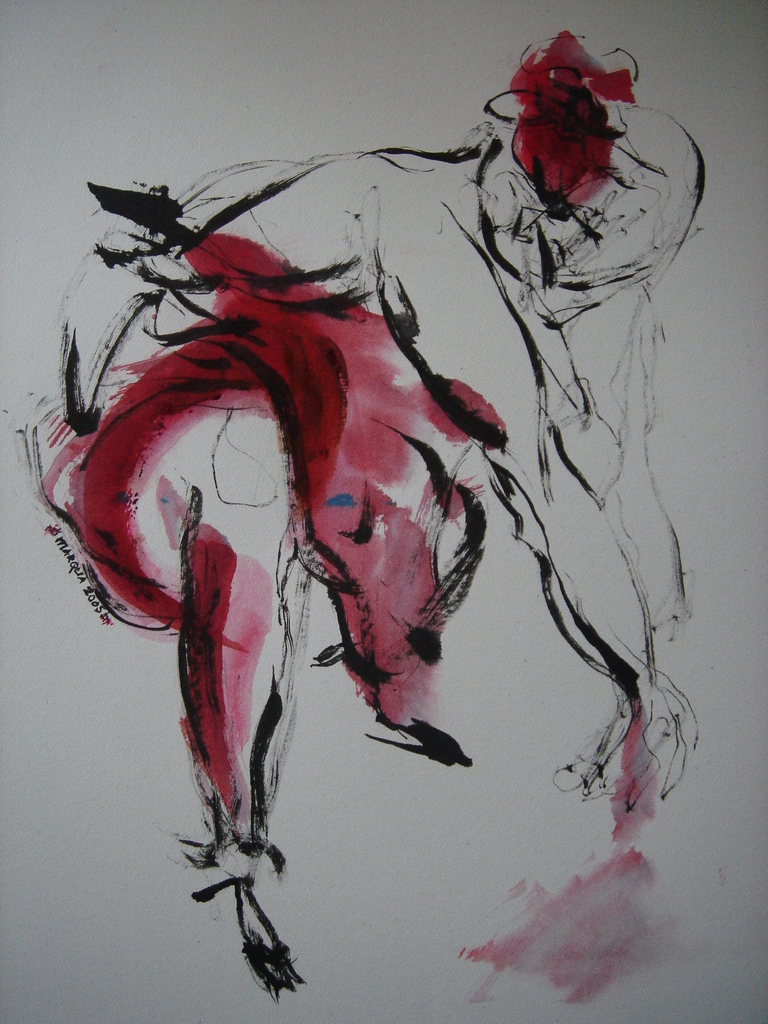 SUMI-E: Oosterse techniek, in inkt en aquarelverf op rijstpapier en daarna verwerkt op aquarelpapier 50x70 cm. Vrouw bukkend in rood.