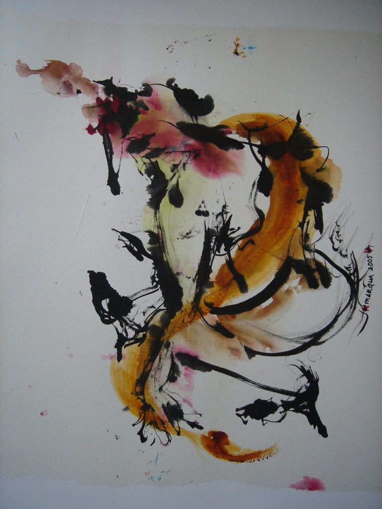 SUMI-E: Oosterse techniek, in inkt en aquarelverf op rijstpapier en daarna verwerkt op riaquarelpapier 50x70 cm. Vrouw zittend in geel.