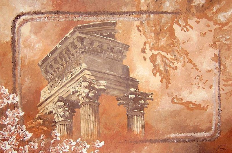 Landschap Tempel Architectuur Griekenland Romijns Standbeeld Ruine Figuratief Italie Palmyra Klassiek Tafereel Geel Schilderij Doek Ruines Zand Woestijn Arabieren Egypte