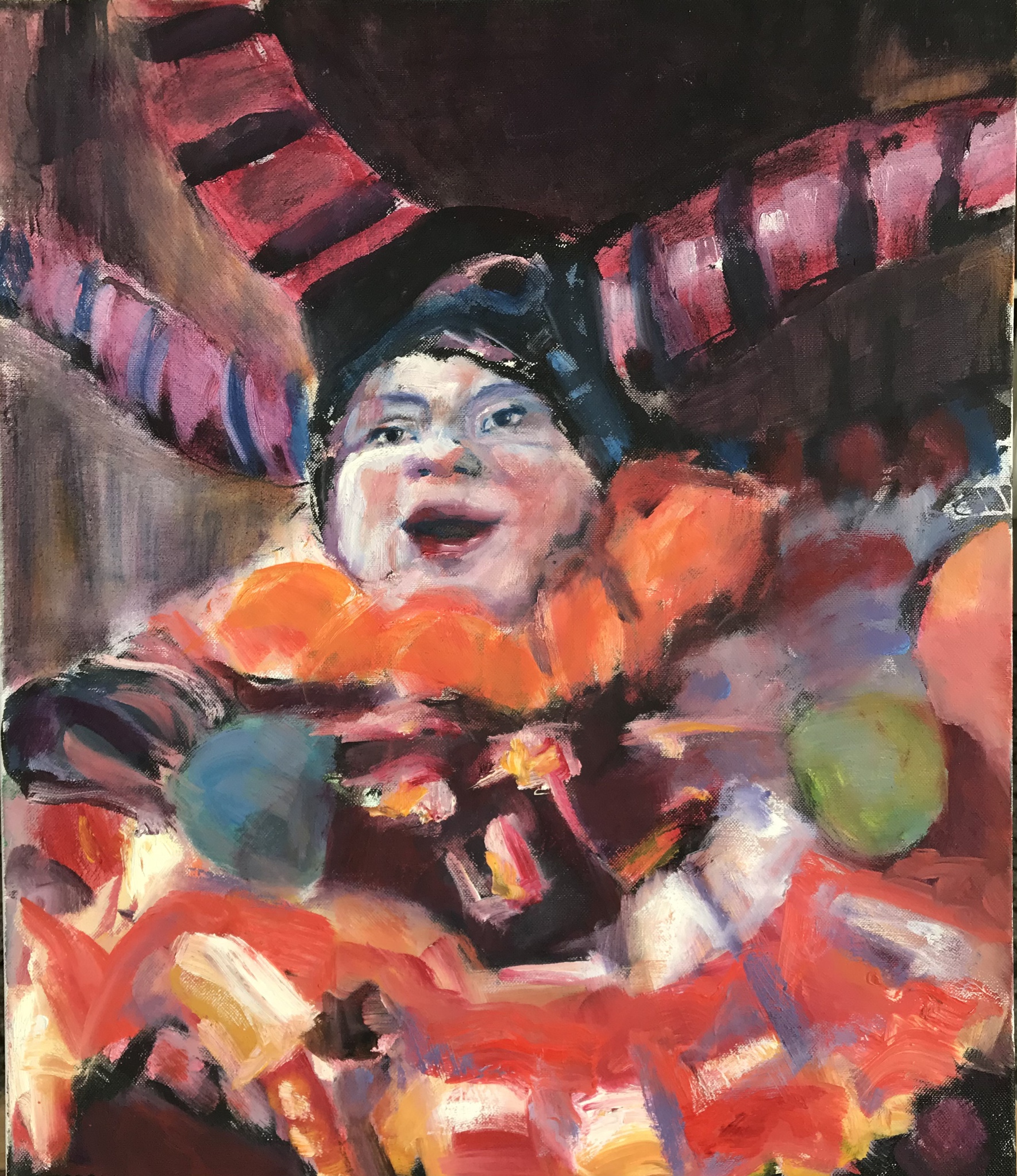 Clown in Rio de Janeiro, getekend en geschilderd met rietpen en penseel in Oost-Indische inkt en olieverf op doek, 50x60 cm. Vele kleuren, o.a. blauw, rood, oranje, paars, oranje, geel wit, groen harlekijn pipo realistisch modern portret figuur mens man Marion Janssen Quaadvliet