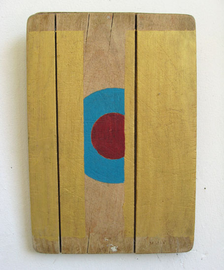 Deze Nihilistisch hedendaags existentieel beeldend kunstenaar verkiest als draagvlak voor zijn in olieverf uitgewerkte iconen alledaagse gebruiksvoorwerpen van hout.