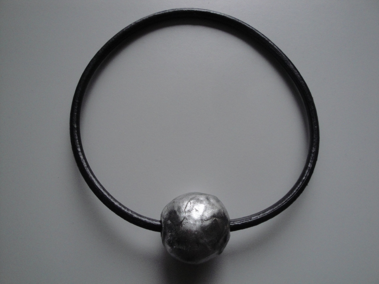 zilverkleurige bol (kunststof op hout) ongeveer 4 cm doorsnede, aan lederen koord met kliksluiting. sluiting kan onder de bol worden verborgen. in diverse kleuren verkrijgbaar