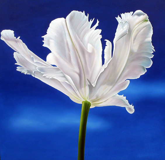 Bijzondere witte tulpensoort tegen helder blauwe lucht. Geschilderd met behulp van alle kleuren van de regenboog...