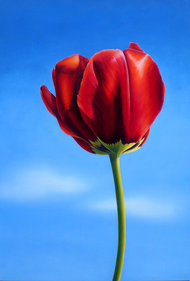 Geen wolkje aan de lucht... Statige bloedrode tulp, afgetekend tegen de blauwe lucht