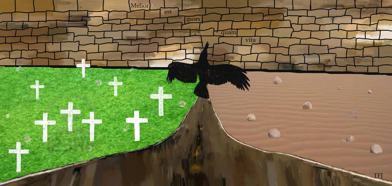Dit is een schilderij wat ik heb gemaakt om het verschil tussen leven en dood te symboliseren Hoort ook een tekst bij een klein stukje van de tekst: Rijdend door de wereld, helemaal alleen. Het neemt je ziel, je staat alleen