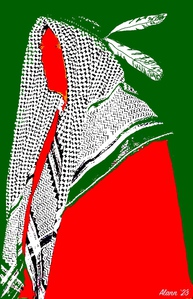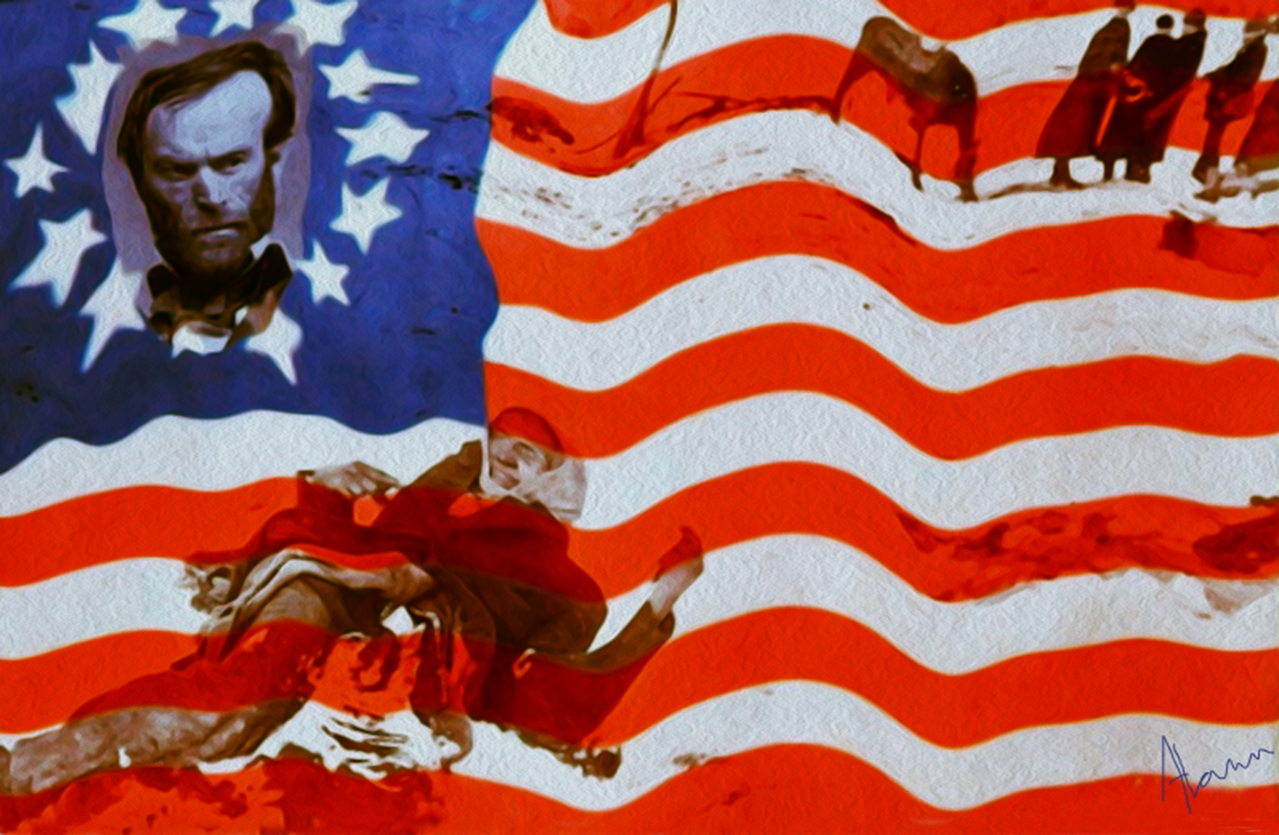 Een quote van W.Bush. Op de vlag generaal James H. Carlotn die de Indianen van hst mid zuidwesten dwong om zich te onderwerpen aan Washington of te sterven.