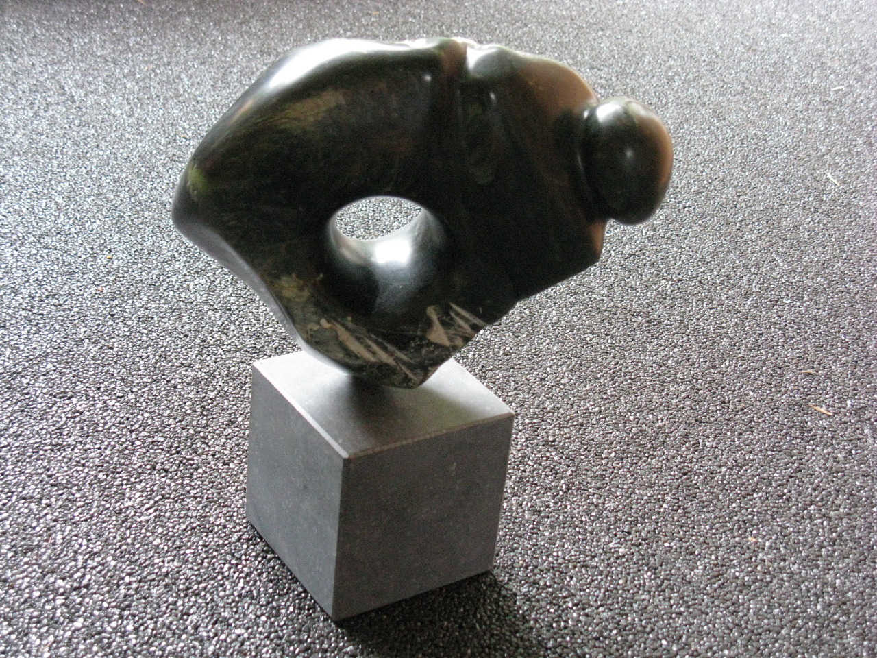 Voorover gebogen op het stuur Trotseert hij weer en wind Bedwingt fier de hoogste berg Maar voelt zich slechts een dwerg In de grootsheid van de natuur Steen: speksteen