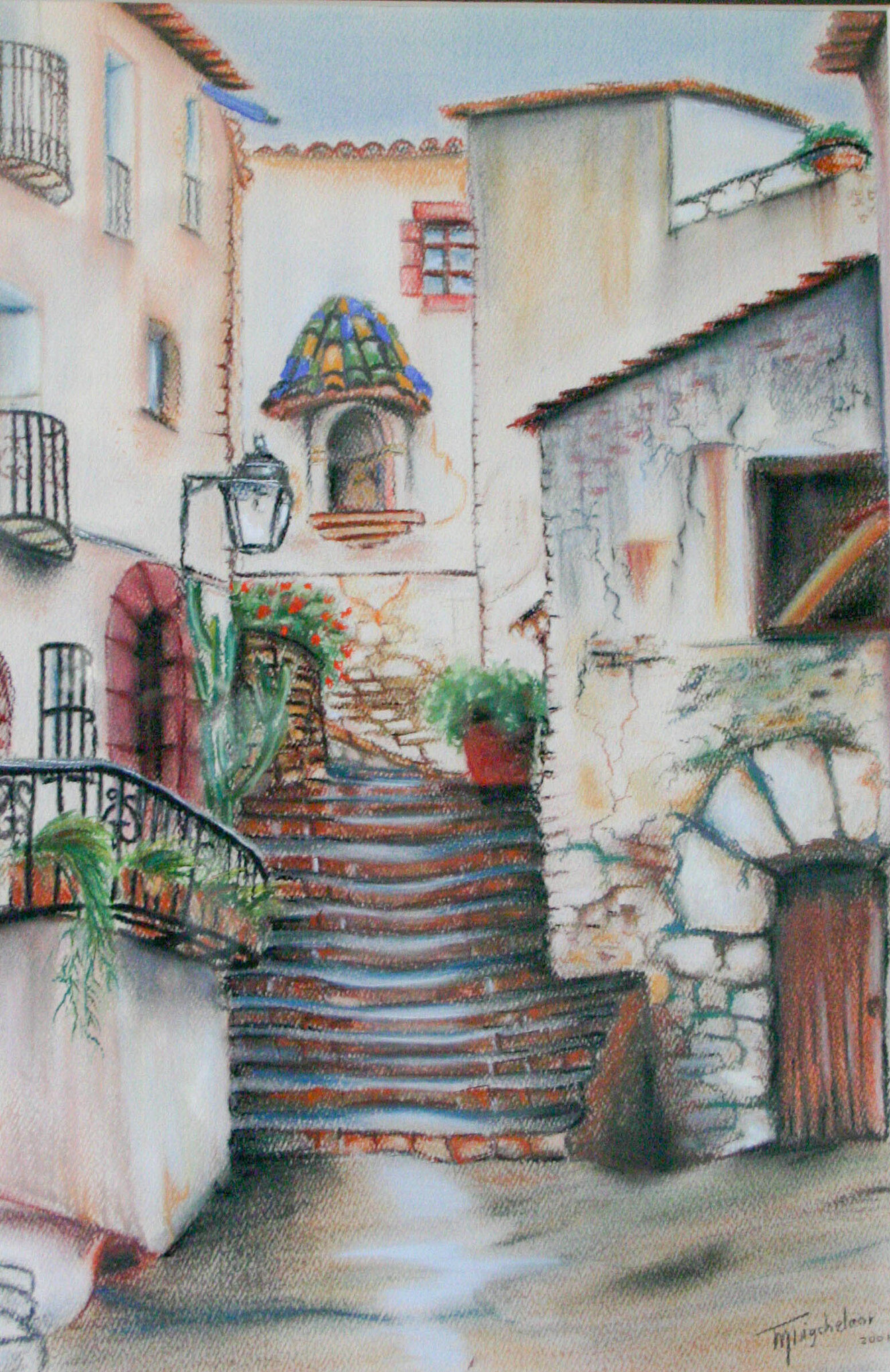 Een trap in een Spaans dorp met pastel krijt getekend.