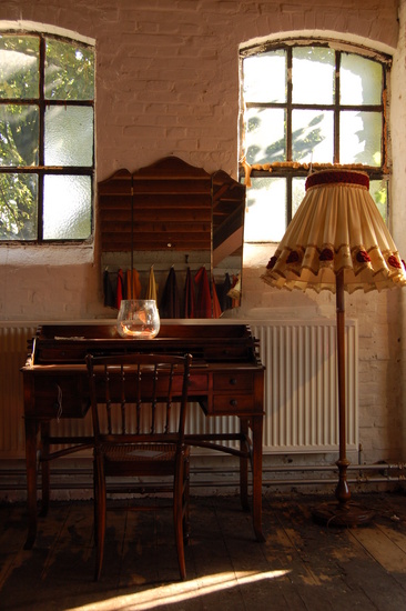 Foto gemaakt bij voormalig Mad Cow's te Dongen. Te zien is een oude schrijftafel met fraaie lamp in een oude leerfabriek.
