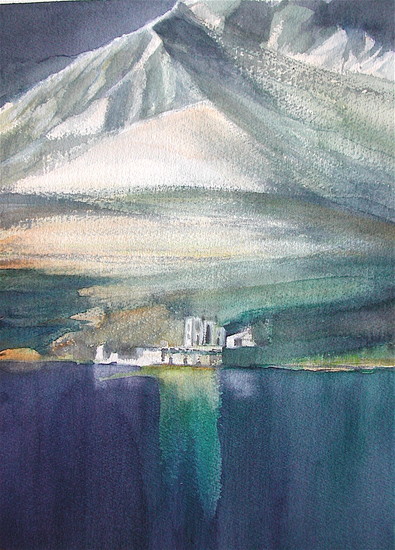Deze aquarel werd gemaakt nà mijn reis in Afghanistan aa, de Lac de Ben-di-amir