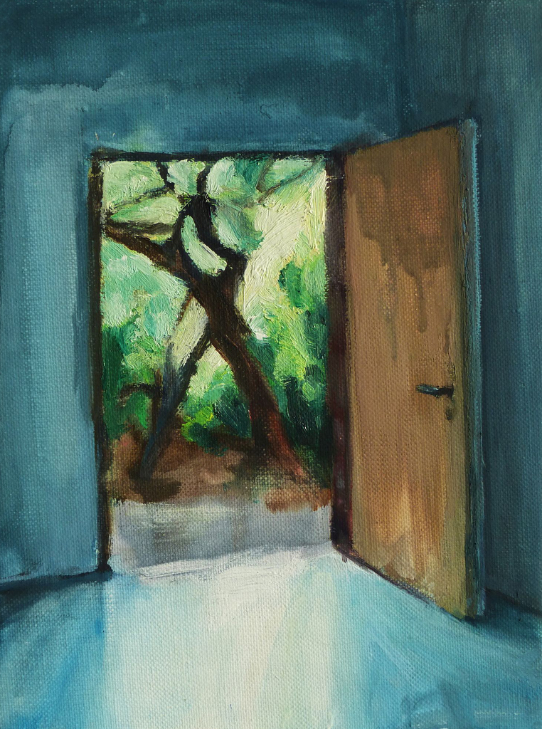 De magie van Insel Hombroich is de verbinding die wordt gelegd tussen architectuur en natuur. Dat heb ik willen laten zien in dit schilderij. Het interieur is geschilderd met gouache, het groen buiten met olieverf om de helderheid en het licht te kunnen benadrukken.