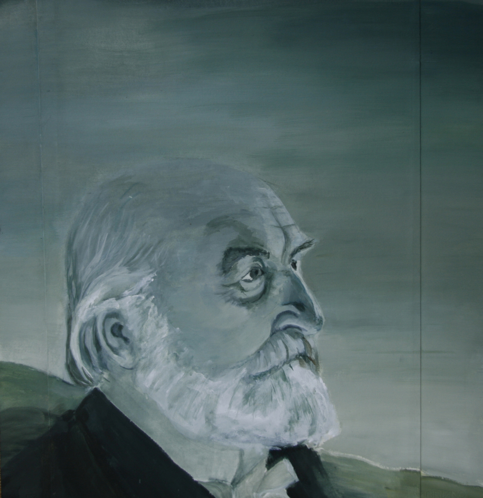 Portret van de kunstschilder Alfred Hafkenscheid, de verte overpeinzend, is gemaakt tijdens een van de masterclasses van 'Het Portret van Drenthe'