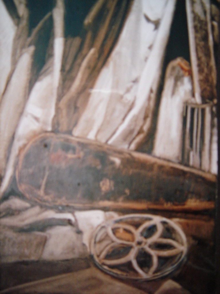 Stilleven vioolkist, geschilderd in olieverf op bewerkt karton 50x70 cm.