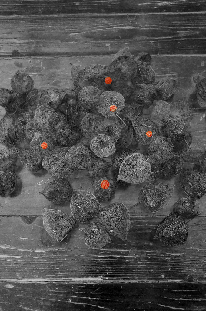 Physalis zaden op mijn tafel. Geprint op stevig Hahnemühle Büttenpapier 20 x 30 cm., Geleverd in passe-partout 30 x 40 cm. | Ook leverbaar op formaat 30 x 45, verlijmd op dibond, informeer naar prijs en mogelijkheden | opl. 10