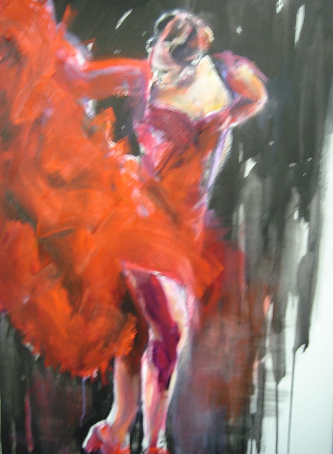 Flamenco danseres, druipende Oost-Indische inkt getekend en geschilderd en daarna aangevuld met olieverf op linnen doek 60x90 cm.