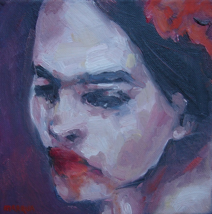 Portret "Lita-Cabellut-impressie", geschilderd in olieverf op doekje 20x20 cm.
