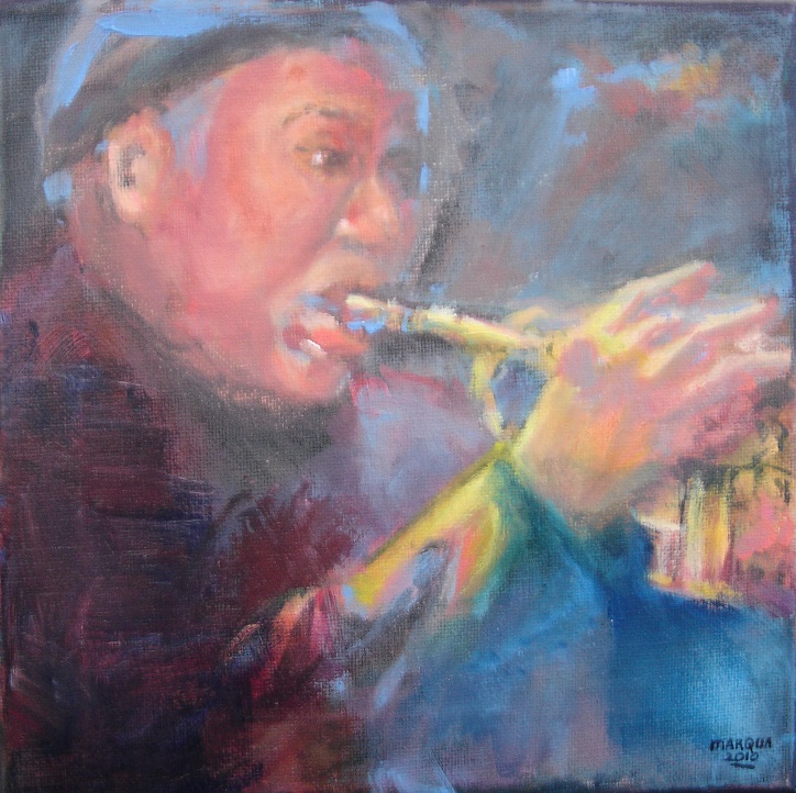 Muziek: Trompetist, getekend en geschilderd met rietpen en penseel in Oost-Indische inkt, aangevuld met olieverf op doekje 20x20 cm. Ik heb vele kleine doekjes geschilderd, een leuk idee is om er een aantal samen op te hangen, geheel naar eigen keuze!