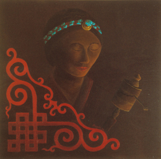 Tibetaanse dame die haar geloof (boeddhisme) beoefend. In de linker hoek het teken voor het eeuwige leven. Zie www.angekavanderknaap.nl